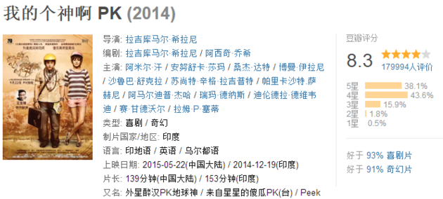柳权初次尝试协助引进的印度影片是阿米尔·汗主演的《我的个神啊》,票房一举拿下1.18亿元。“2015年国家签了一个中印电影合拍的协议,根据政策形式我们开始寻找一些经过审核的印度电影,当时《我的个神啊》在印度的票房排名是第一。”