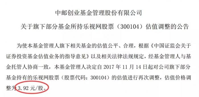 2017年11月15日,多家基金公司公告显示,乐视网再下调50%,估值价格调整为3.92元。加上之前的重估价7.82元。