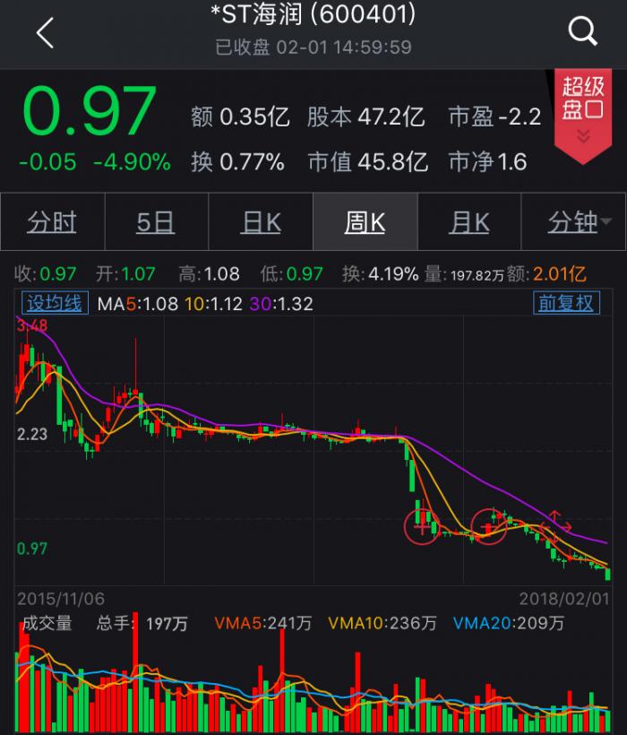 2月1日晚,连续两天跌停的*ST海润(600401.SH)发布公告称,截止2018年2月1日,公司股票收盘价为0.97元/股,低于公司股票面值。如果公司股票连续20个交易日(不包含公司股票停牌日)的每日股票收盘价均低于股票面值,公司股票将被终止上市。