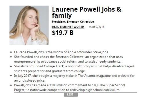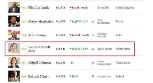 据福布斯实时富豪榜,截至北京时间2月2日下午5时,现年54岁的鲍威尔身家为197亿美元,在全球富豪榜排名第66位。2016年,鲍威尔一度成为科技界女首富。