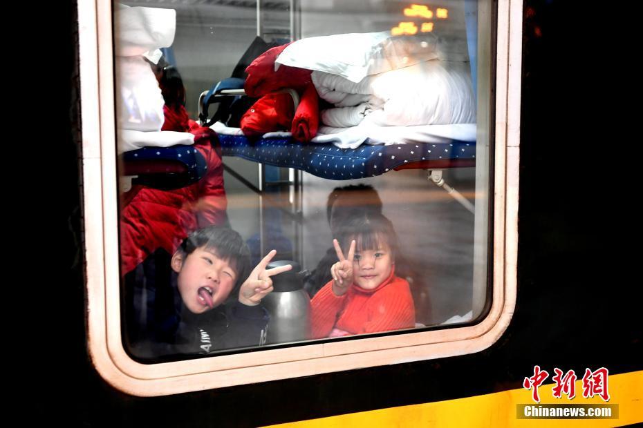 福州火车站的一列卧铺车厢里,一对兄妹做出胜利的手势,对即将回到的家充满了期待。火车上的漫长旅途对于他们来说,可能更像一次冒险的旅程。(中新网 王东明 摄)