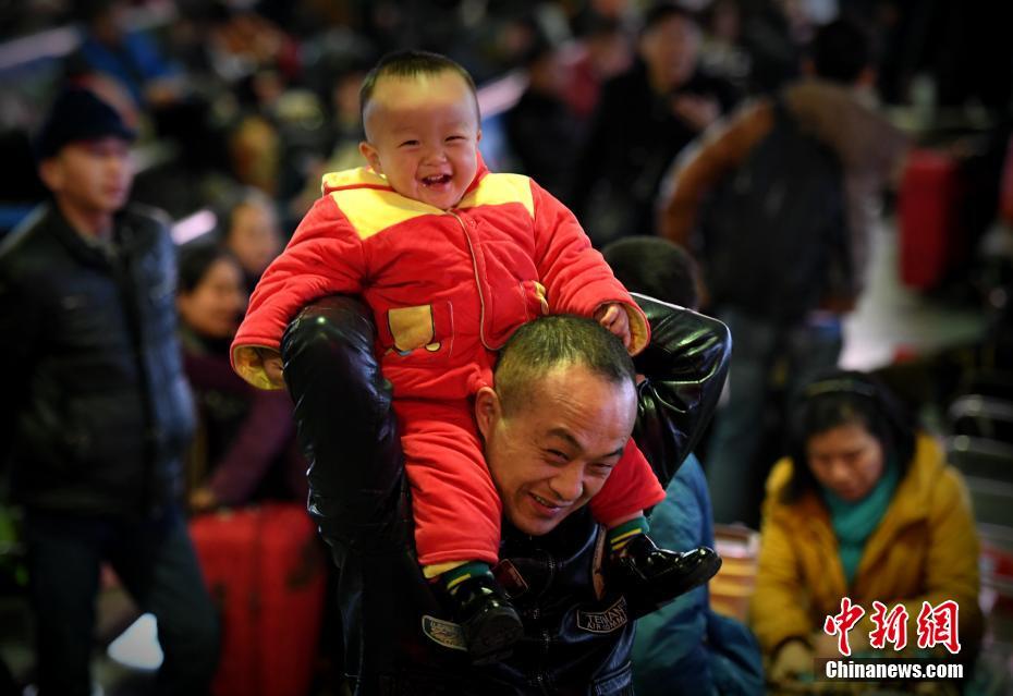 来自安徽的洪先生抱着10个月大的儿子在福州火车站候车室嬉戏,儿子露出了开心的笑容。(中新网 王东明 摄)
