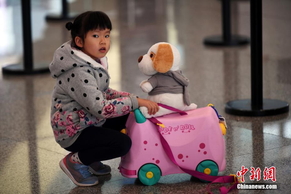 1月25日,山西省太原南站,一名“小候鸟”随着家长准备乘火车返乡。(中新社记者 韦亮 摄)