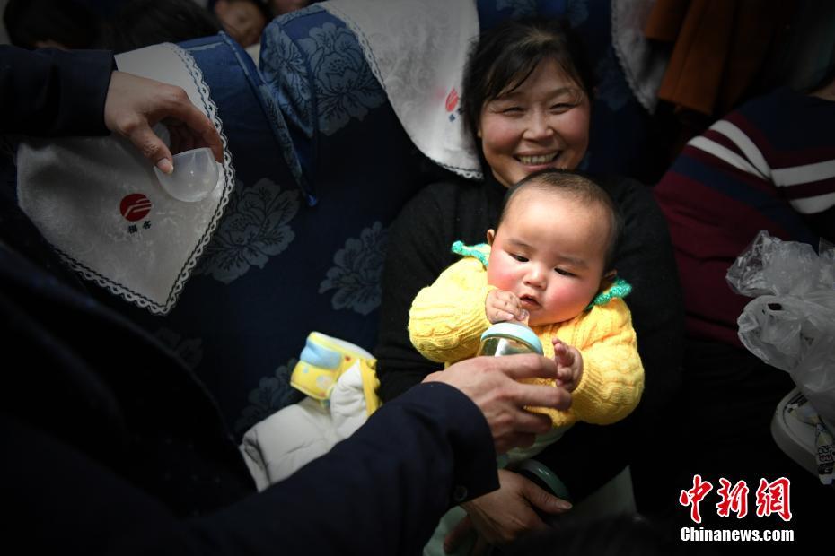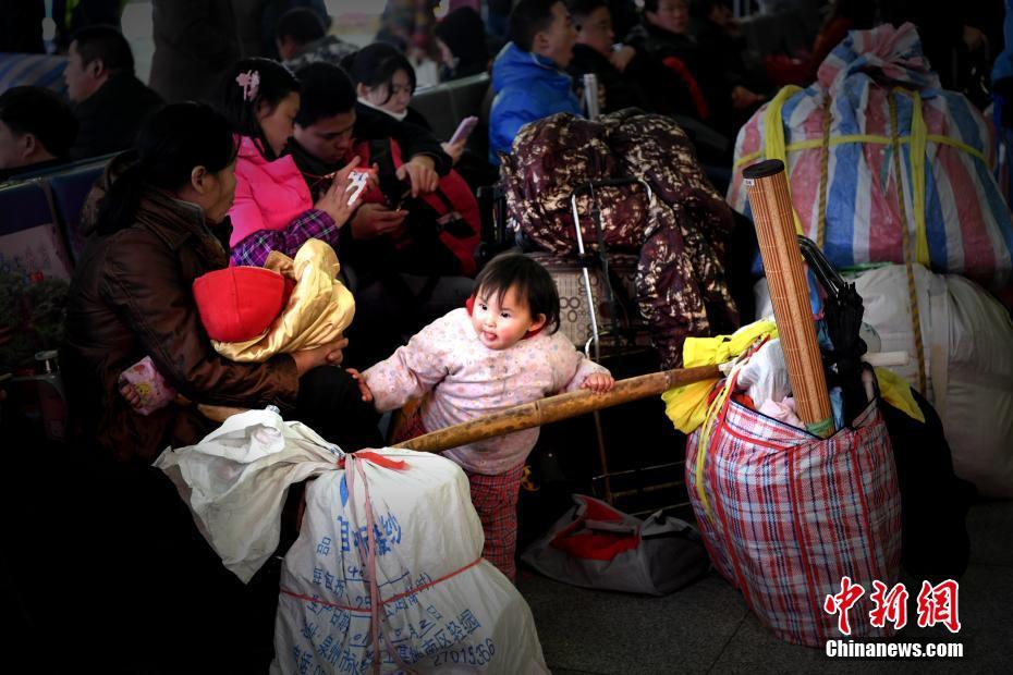 2月1日,不到一岁的小女孩跟随在福州打工的父母即将坐上返回达州的加开班列。虽然这一家子行李不少,但有了小朋友的陪伴,这趟旅途一定充满欢乐。 (中新网 王东明 摄)