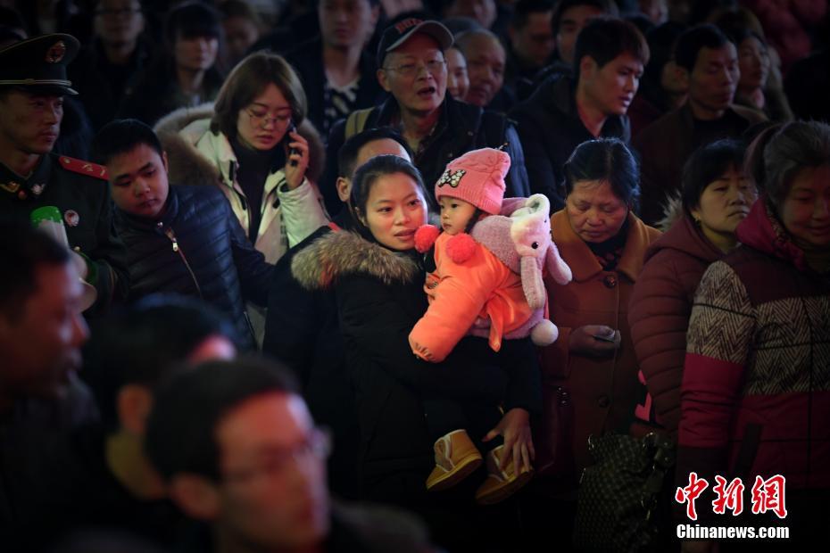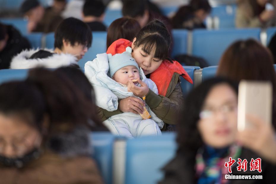 2月1日,福州火车站内的一位母亲抱着穿上新衣服的女儿,即将坐车返回江西老家。孩子可爱的穿着成为人群中的一抹亮色。(中新网 王东明 摄)