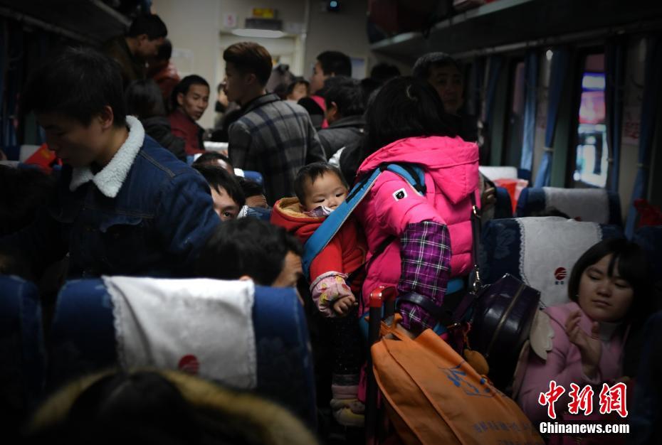 福州火车站的一列车厢中,在襁褓中的小孩跟随父母在车厢中等待启程。小朋友还不懂拥挤的苦恼,周围的一切对他来说都很新鲜。 (中新网 王东明 摄)