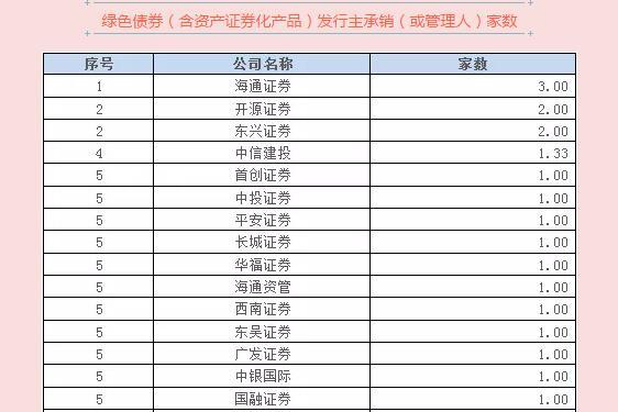 在绿色债券(含资产证券化产品)发行主承销(或管理人)家数方面,共有21家券商上榜。其中有15家券商发行家数为1家及以上。海通证券以3家的数量位居榜首。开源证券、东兴证券各有2家。首创证券、华福证券、国融证券、太平洋证券、川财证券中小券商均有收获。