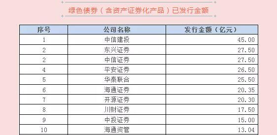 在绿色债券发行金额方面,中信建投则问鼎冠军。尽管中信建投的主承销加速只有1.33家,但是发行金额达到了45亿元,稳居榜首。东兴证券、中信证券分别以27.50亿元的发行规模位列其后。根据协会数据,共有11家券商发行规模超过了10亿元。