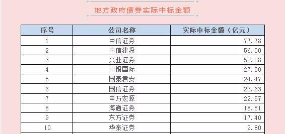 在地方政府债券实际中标金额方面,共涉及到了38家券商。其中9家券商的规模超过了15亿元。规模在1亿元至9亿元之间的券商有20家。规模最小的为东方财富,为0.10亿元。