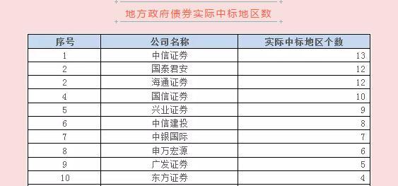 地方政府债券实际中标地区数方面,大券商则更显优势。中信证券以13个的实际中标地区个数居于榜首。国泰君安、海通证券分别以12个的数量紧随其后。此外,国信证券中标地区属也超过10个。包括财达证券、第一创业、广州证券、国海证券、民生证券在内的20家券商实际中标地区个数仅为1家。
