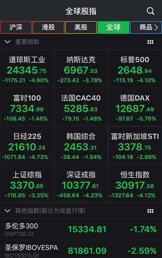 截至收盘,沪指收报3370.65点,跌3.35%,成交额3188亿。深成指收报10377.61点,跌4.23%,成交额2408亿。创业板收报1598.12点,跌5.34%,成交额614亿。