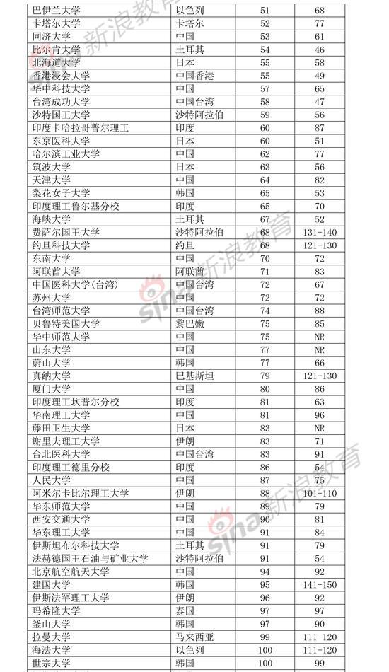 本次大学排名前十中,中国高校占据五席,除了清华、北大之外,香港大学位列第四,香港科技大学和南洋理工大学并列第五,香港中文大学则排在第七位。第八至第十位的高校分别是东京大学、首尔大学和韩国科学技术院。