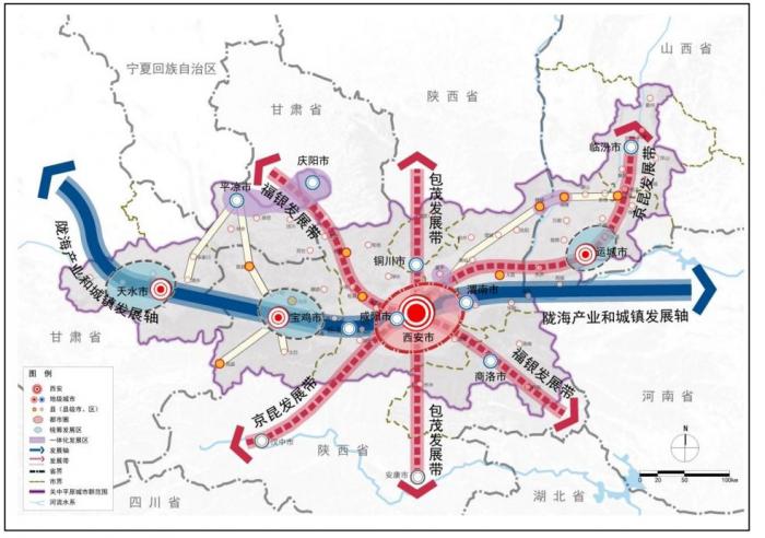 本次《关中平原城市群发展规划》的范围,包括陕西省西安、宝鸡、咸阳、铜川、渭南 5 个市、杨凌农业高新技术产业示范区及商洛市的商州区、洛南县、丹凤县、柞水县,山西省运城市(除平陆县、垣曲县)、临汾市尧都区、侯马市、襄汾县、霍州市、曲沃县、翼城县、洪洞县、浮山县,甘肃省天水市及平凉市的崆峒区、华亭县、泾川县、崇信县、灵台县和庆阳市区,国土面积 10.71 万平方公里,2016 年末常住人口 3863 万人,地区生产总值 1.59 万亿元,分别占全国的 1.12%、2.79%和 2.14%。