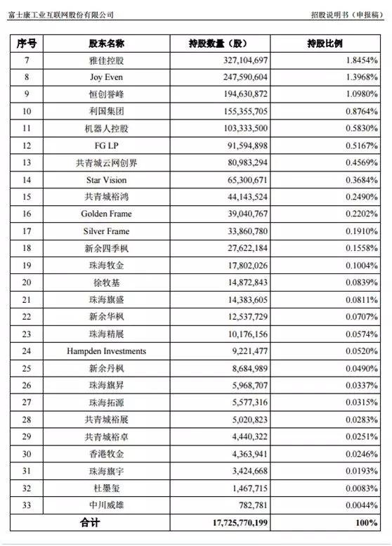 富士康最新的股东名单中,有33位股东,持股总数为177.26亿股,第一大股东(控股股东)中坚科技持股72.93亿股,占比41.14%。