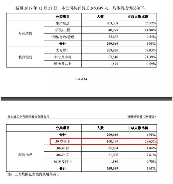 富士康的员工人数也是在A股排名前10位,仅次于中石油中石化、四大行、外加中国平安和中国中铁。员工总数26.9万人,其中30岁以下员工16万人,占到了约60%。