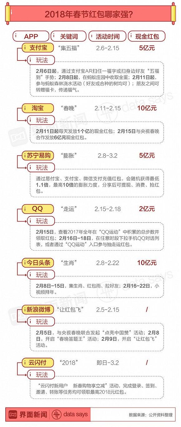 据界面新闻不完全统计,截至目前,支付宝、淘宝、苏宁易购、QQ、今日头条、新浪微博、云闪付等7家APP均已正式宣布加入“红包大战”,它们各出奇招,“撒币”总额达到数十亿元人民币。