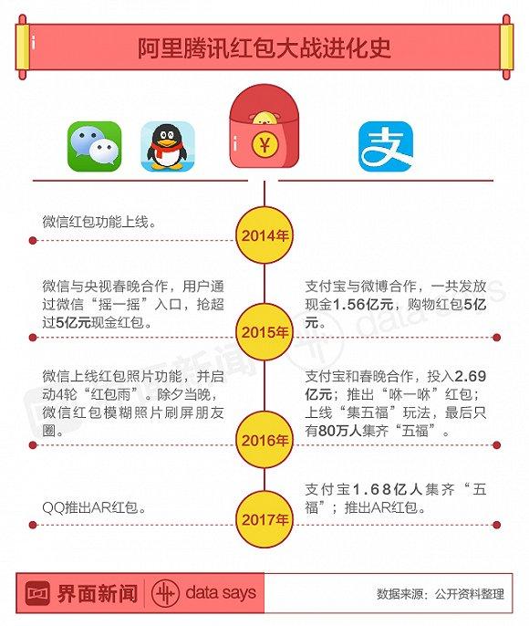 此后,春节红包就成了阿里和腾讯必争之地,双方在多个领域“针锋相对”。比如,微信“摇一摇”,QQ“刷一刷”,支付宝“咻一咻”;2015年央视春晚的合作方是微信,2016年以后就变成了支付宝;支付宝和QQ都在2017年推出了AR红包。