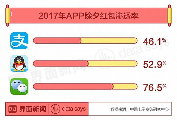 不过,从用户渗透率来看,社交属性突出的腾讯系平台的红包参与度要高于阿里系。中国电子商务研究中心数据显示,2017年除夕,微信红包渗透率达到76.5%,远高于支付宝的46.1%。
