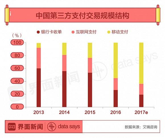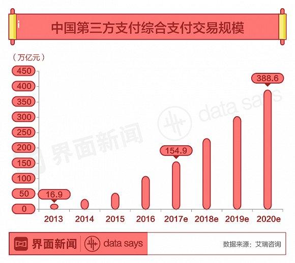 艾瑞咨询数据显示,中国第三方支付交易规模在近五年增速迅速,2017年达到154.9亿元,是2013年的9倍,其中,超八成市场都被互联网支付和移动支付占据。