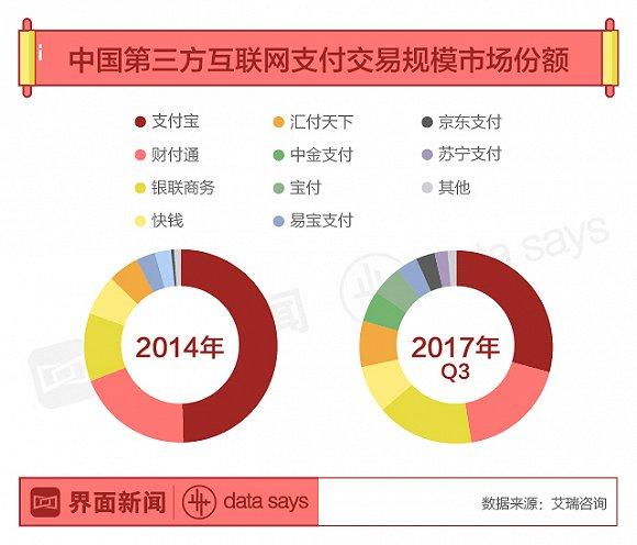 艾瑞咨询数据显示,2014年支付宝和财付通独霸近70%的市场份额,到2017年第三季度,支付宝和财付通的市场份额缩水至不足50%,其中支付宝的缩水幅度最大。与此同时,越来越多的公司进入了第三方支付市场并占据了一席之地,对支付宝和财付通的地位构成了威胁。