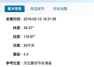 18点32分左右,北京、天津等地部分居民所在建筑物有摇晃的感觉。21世纪经济报道记者从中国地震台网获悉, 2月12日18时31分在河北廊坊市永清县附近发生4.4级左右地震,震中位于北纬39.38度,东经116.66度。