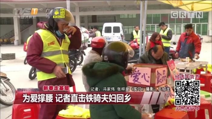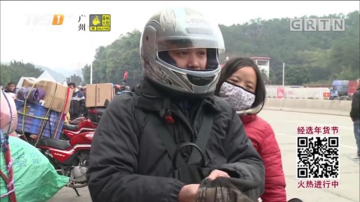 广西藤县大胜村民黄大哥说:“开车回去的话十多年了,今年回家感觉没有那么冷,天气算是可以了。”黄大哥两夫妻是顺德一家制衣厂的工人,离开家乡到广东打工已有十多年,每年春节前几天,他们都会骑摩托车回家和家人团聚。