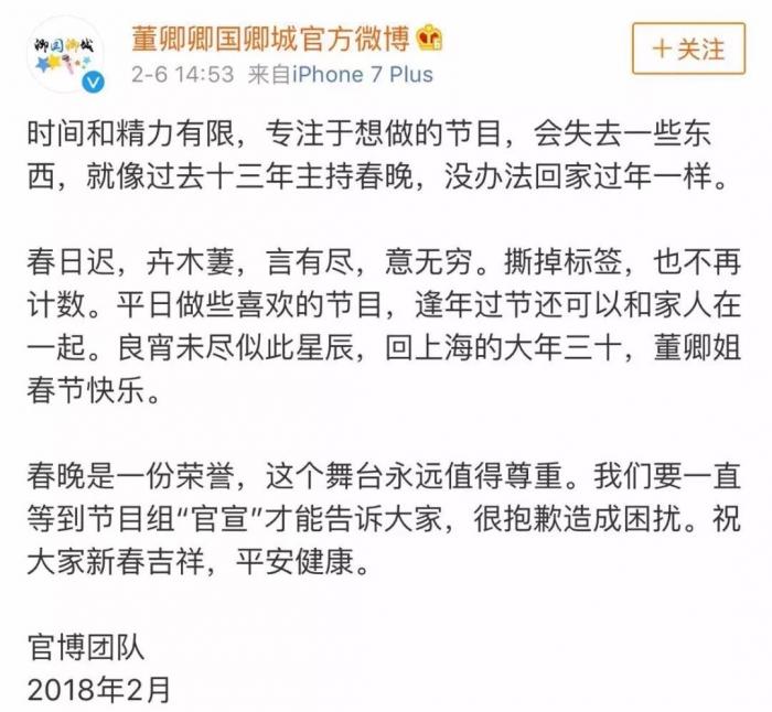 春晚主持阵容发布后,董卿的官方微博发了一条消息: