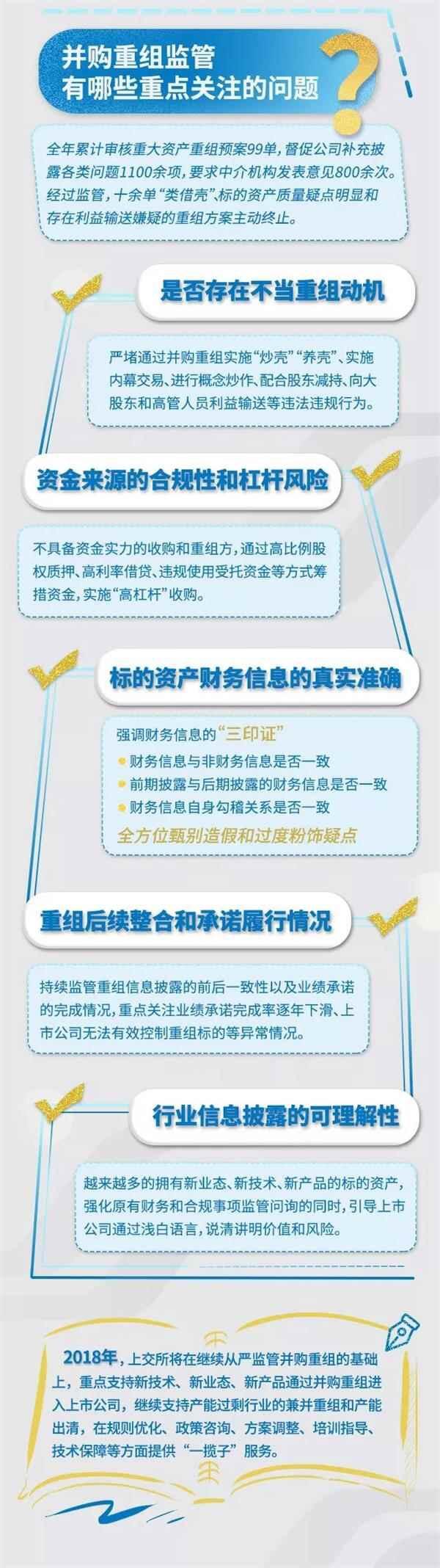 上交所官方微信发文称,2018年将在继续从严监管并购重组的基础上,重点支持新技术、新业态、新产品通过并购重组进入上市公司,继续支持产能过剩行业的兼并重组和产能出清,在规则优化、政策咨询、方案调整、培训指导、技术保障等方面提供一揽子服务。