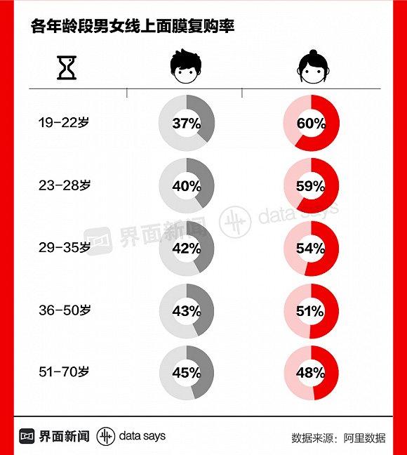 网购数据也映证了这一趋势。阿里数据显示,随着年龄的增加,女性的面膜复购率逐渐下降,男性的面膜复购率则逐步攀升,51-70岁的男性消费者的面膜复购率达到了45%,只比同龄女性低3个百分点。