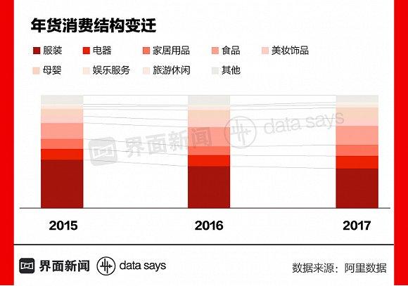 不管什么节日,送吃的永远是最安全的选择。阿里数据显示,2015年至2017年,服装和食品都是年货消费的“大头”,其中,服装的消费占比在不断降低,食品则在不断升高。