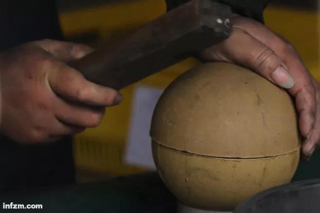 ▲湖南省浏阳市的一个烟花生产车间,工人用木棍敲击一个礼花弹的外壳,使其内部的装药均匀,敲击的力道相当讲究,需要多年的经验才能控制好。(南方周末特约摄影 张涛/图)