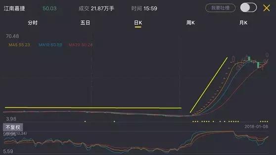 从K线图,可以看出,在11月之前,江南嘉捷股价长期横盘,自11月2日晚间公告确认被360借壳之后,股价开始狂奔,一口气拉出18个涨停。股价从9.67元起步,到11月30日已经收报48.90,期间涨幅达到惊人的405.7%。2017年全年涨幅212.6%。