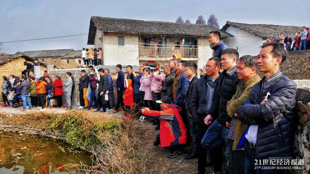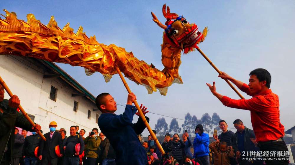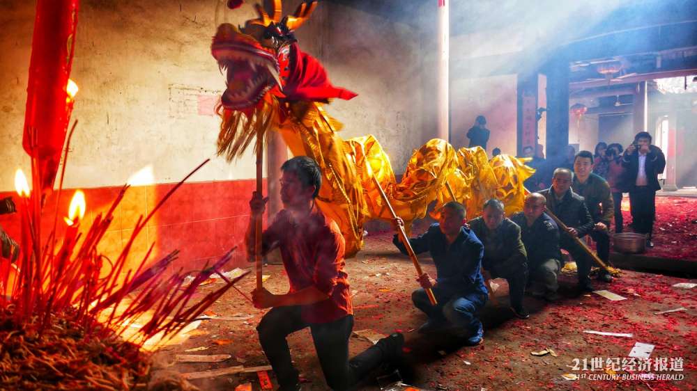 添丁炮前的舞龙 代表着村民祈福来年风调雨顺