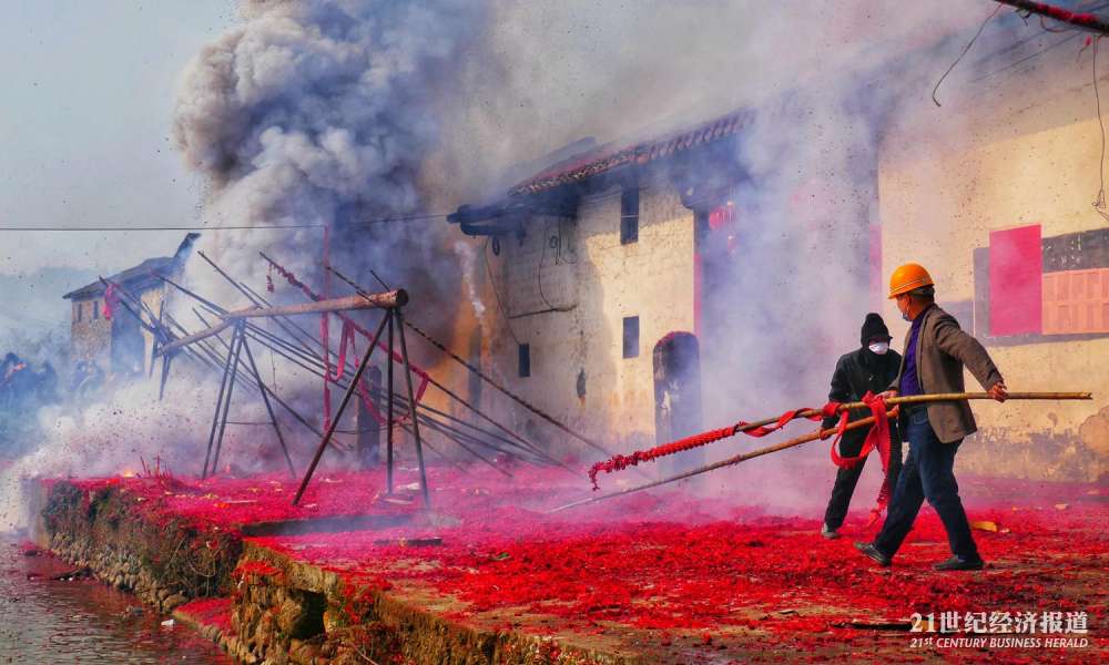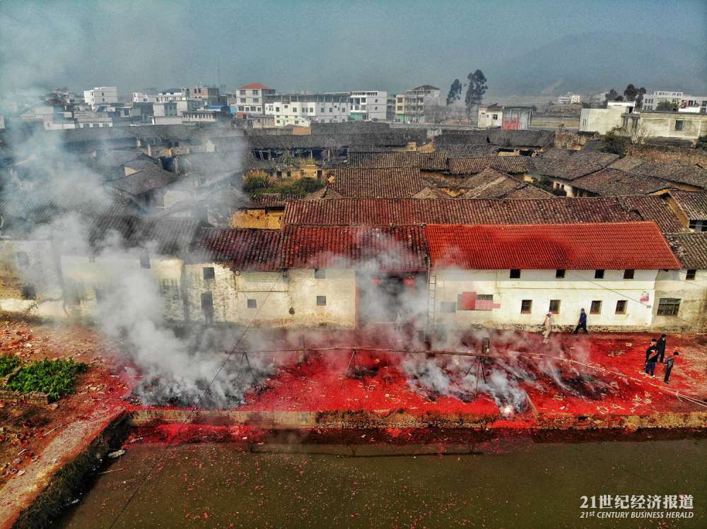 燃放的鞭炮将田心围祠堂地面染成了红色