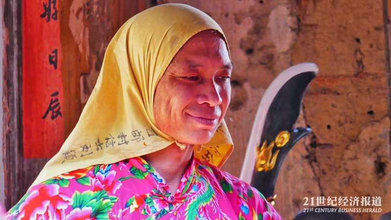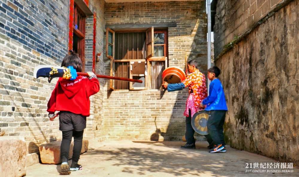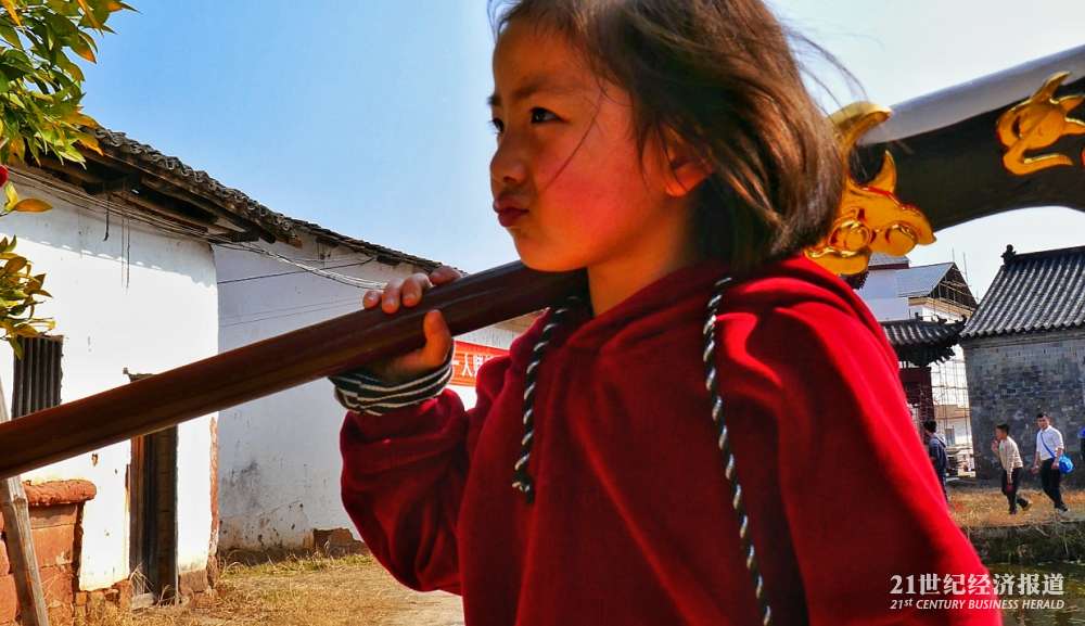 一位小姑娘背着道具大刀跟随着傩舞班子,当起了“道具工”。