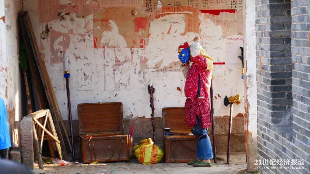 一位“跳傩”的大伯准备上场,他将一直跳下去,从年三十到初十六,他们每到一家,就给村民带去了新年的祝福。
