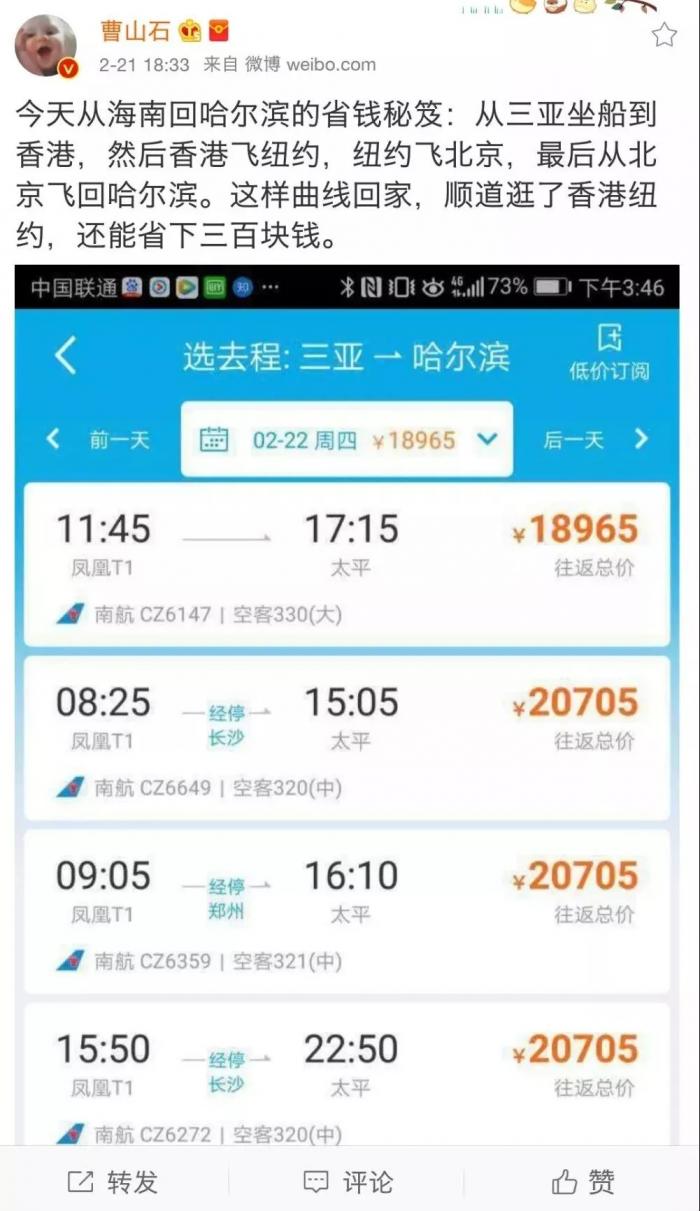 但也有没提前规划的游客,只能各显神通。“这几天的返程机票实在太贵了,父母着急回去上班搭了朋友的顺风车,开车返程。我嫌机票价格太贵买了正月十五后以后的一张公务舱机票,也得8000块。”一位来自上海的大学生告诉中新经纬,相比之下自己12月份购买的去程机票仅1800元。