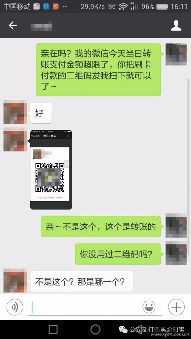 注意,截几张图随时你银行卡的钱都被骗光!大家一定要分清楚微信的转账付款二维码(发给别人,由对方输入扣你钱的金额。上限500,一扫就自动扣你钱)和收款二维码(别人扫了要付你钱)!两个很容易搞混!自然,也被一些无孔不入的骗子钻了空子……