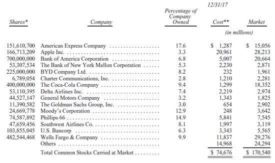 表格中的某些股票,要么由托德-寇姆斯(Todd Combs)负责,要么由泰德-韦施勒(Ted Weschler)负责,他们与我一同管理伯克希尔的投资。二人都独立于我,每人管理的资金均超过120亿美元。我通常是在查看每月投资组合总结时才知道他们作出的决定。在二人管理的250亿美元资金当中,包括伯克希尔某些附属公司超过80亿美元的养老金信托资产。如前文所述,养老金投资并不包括在前面的伯克希尔控股公司的财务报表中。