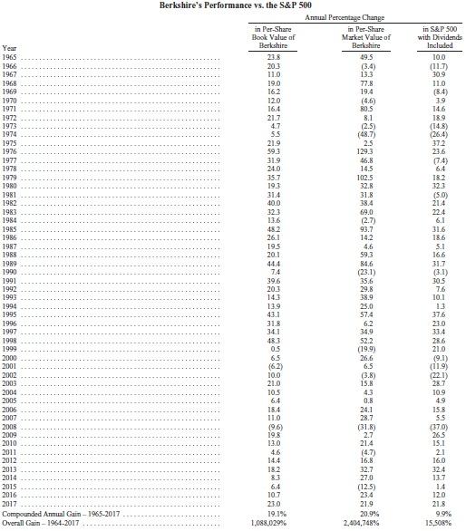 本文起始段的表格已是30年的标准惯例。但是,2017年的业绩却远离一般标准:我们大部分的收益并非来自我们在伯克希尔所完成的任何事情。