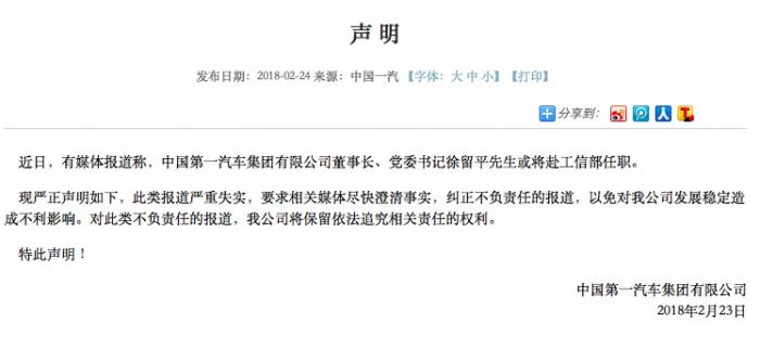 2月23日,中国第一汽车集团有限公司官方正式发表声明,该声明表示,此类报道严重失实,要求相关媒体尽快澄清事实,纠正不负责任的报道,以免对中国一汽发展稳定造成不利影响。对此类不负责任的报道,中国一汽将保留依法追究相关责任的权利”。