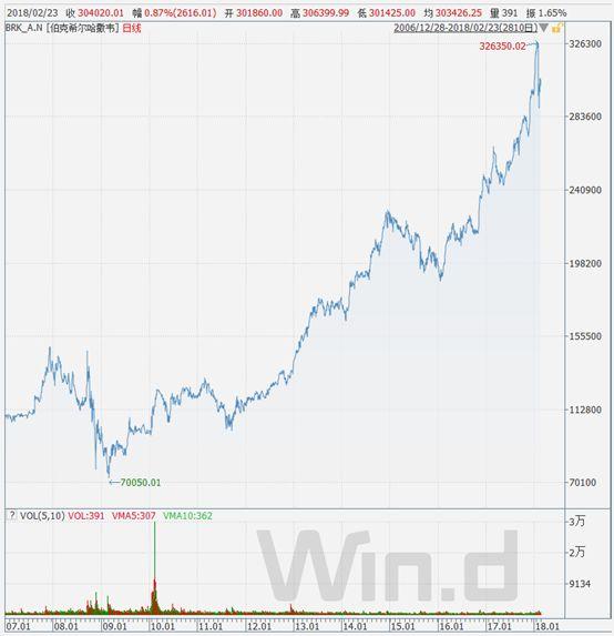 2017年伯克希尔·哈撒韦公司净值大增653亿美元,公司A级和B级股票每股账面价值的涨幅都达到了23%。