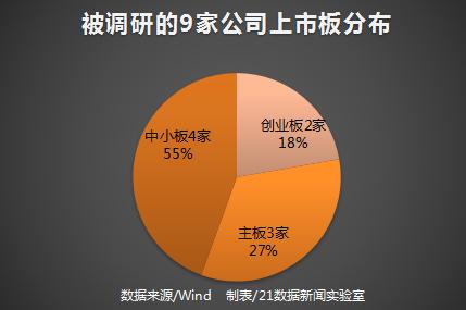 据21数据新闻实验室统计,被机构调研的9家公司中,属于中小板的4家,主板3家,另外2家来自创业板。值得注意的是,当周共有133家机构参与了调研,较前一期(2月5日-2月11日)264家下降近50%。其中私募机构依然最热情,有67家,但占比从40%上升至50%。