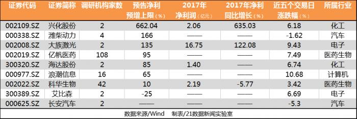其中兴化股份2017年业绩靓丽,归属母公司净利润同比增长超过600%,大族激光业绩快报披露的净利润亦实现翻番。