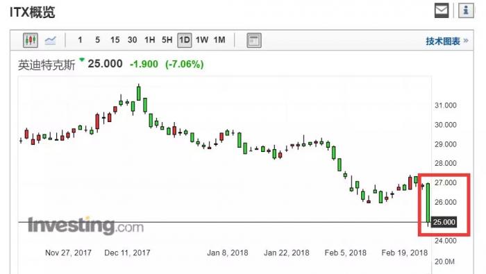 小摩预计西班牙巨头在竞争激烈的大众市场摇摇欲坠的毛利率面临“巨大压力”,因此下调西班牙公司5%预期,同时将目标价由38欧元下调至35.50欧元。摩根大通还称,其相信Inditex在2017年第四季度的后半段的销售有所放缓。当地时间23日,Inditex股价在开盘后两小时跳水,午后一度跌至24.77欧元,不过随后小幅反弹,收报25欧元。