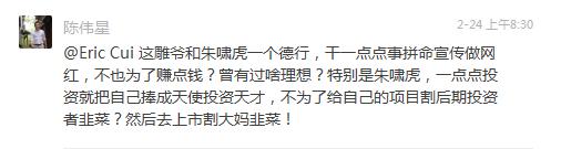 陈伟星怼朱啸虎:朱啸虎把自己捧成投资天才是为了割项目后期投资者韭菜