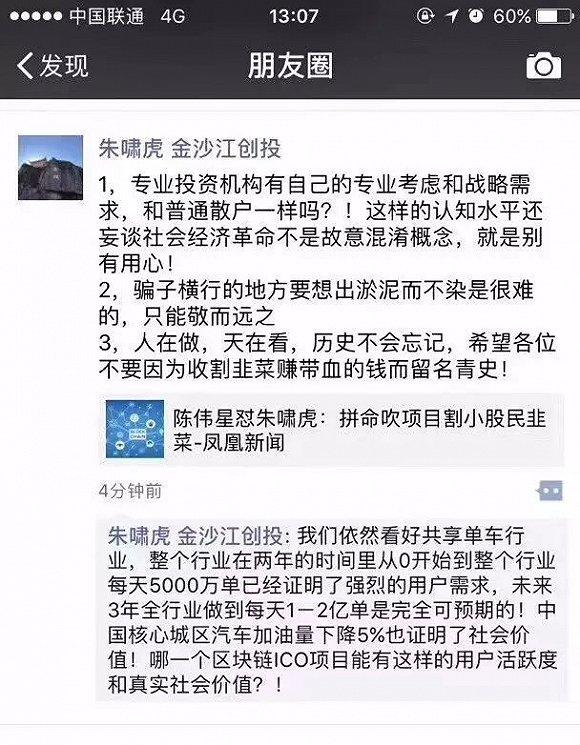 中午1点左右,针对陈伟星的呛声,朱啸虎在朋友圈作出回应,称: