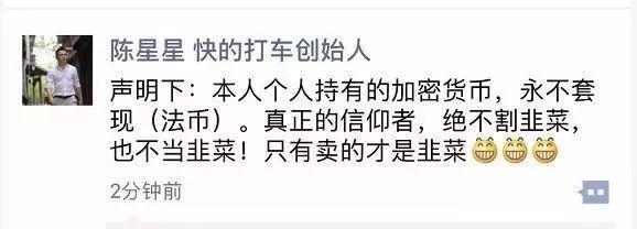 随后,陈伟星发朋友圈声明所持加密货币永不套现,绝不割韭菜。“真正的信仰者,绝不割韭菜,也不当韭菜!只有卖的才是韭菜。”