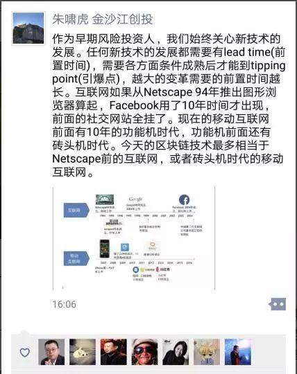 昨天下午4点,朱啸虎再度回应称,现在的移动互联网前面有10年的功能机时代,功能机前面还有砖头机时代。今天的区块链技术最多相当于Netscape前的互联网,或者砖头机时代的移动互联网。