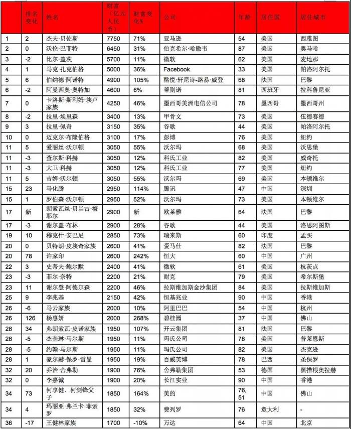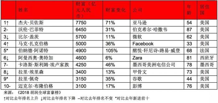 前十中有7人来自美国。杰夫·贝佐斯、沃伦·巴菲特和马克·扎克伯格领航。贝佐斯财富上涨71%成为世界首富,巴菲特财富上涨31%,扎克伯格财富上涨36%。谷歌44岁的拉里·佩奇首次进入前十。68岁的LVMH掌门人伯纳德·阿诺特财富翻倍,重回前十。前10名财富平均增长了37%。